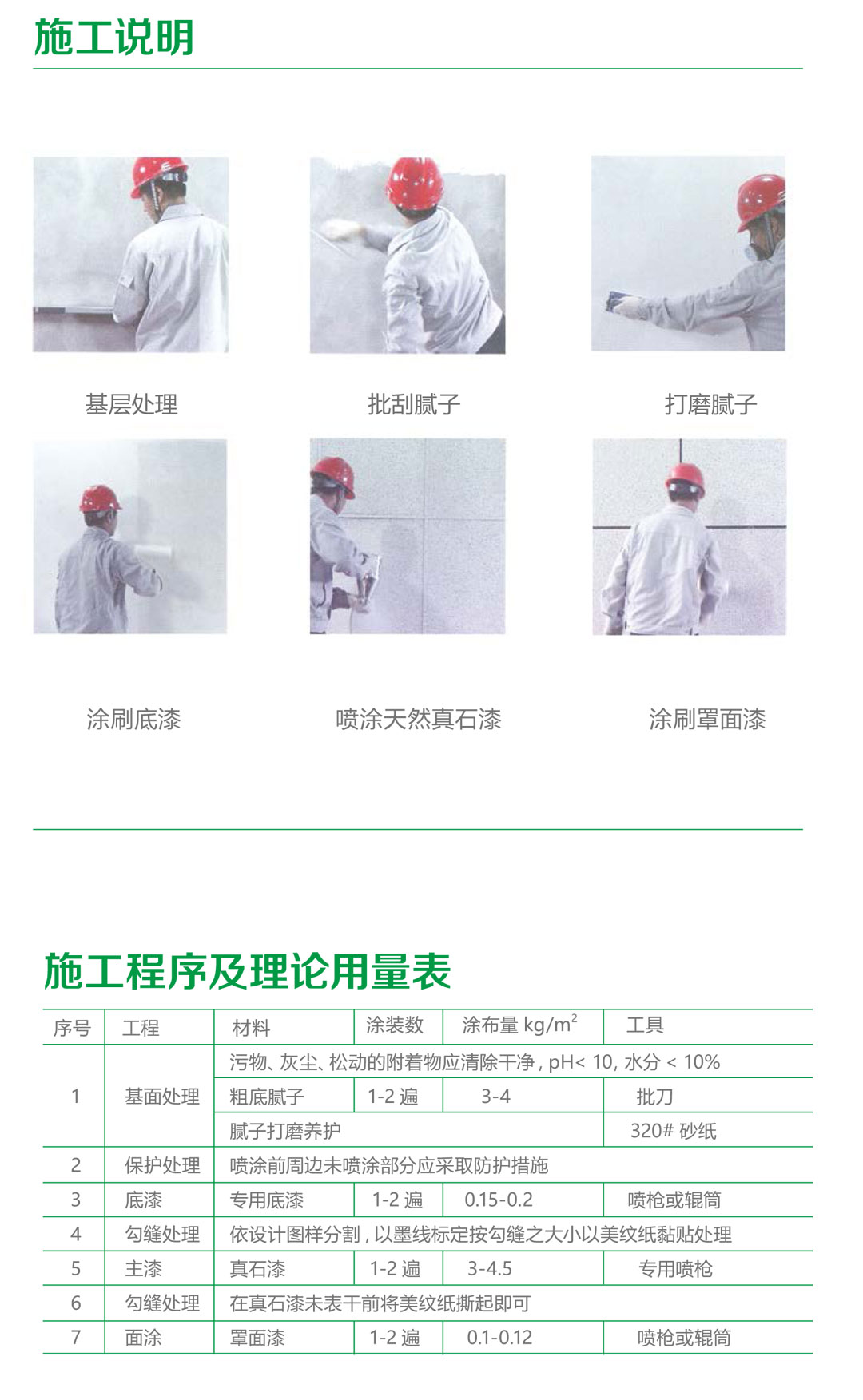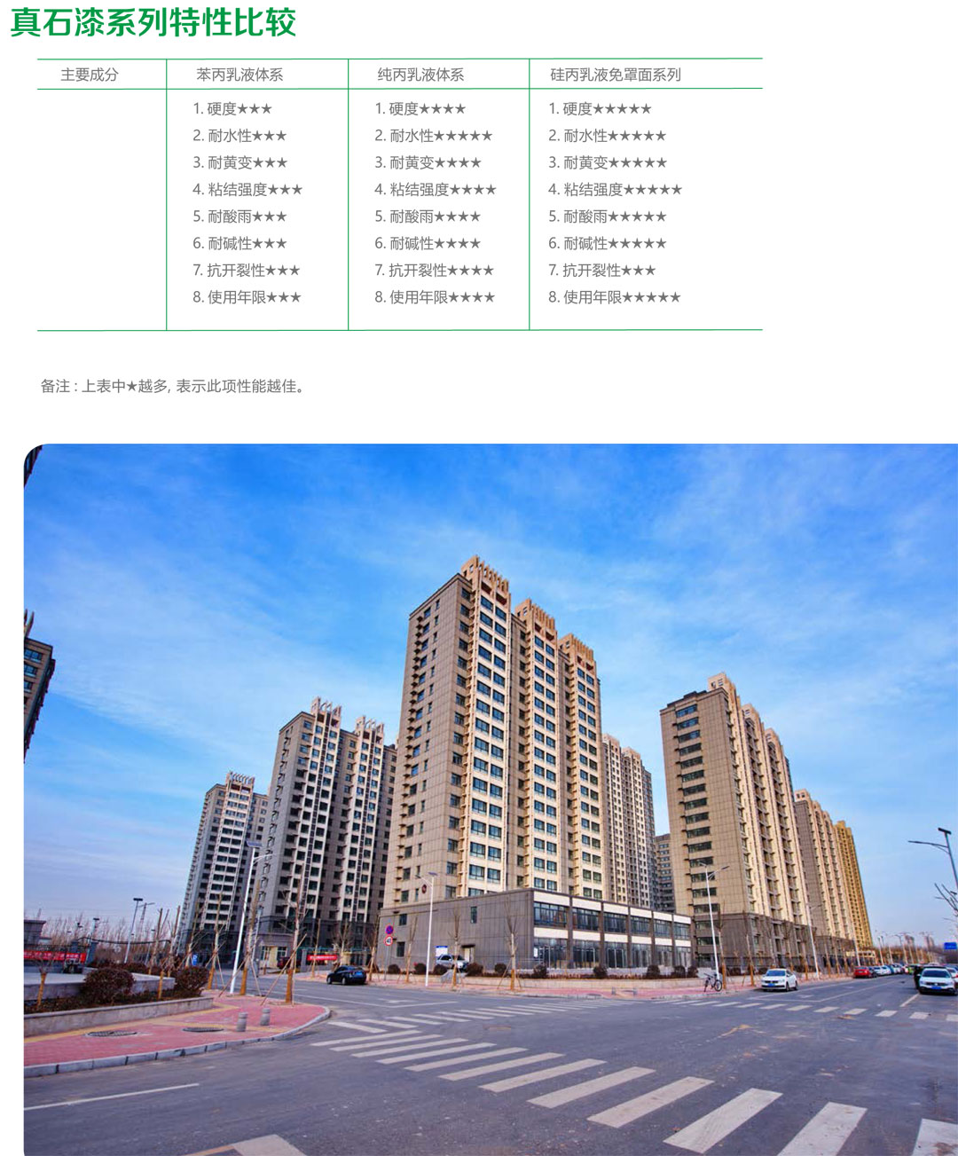 天然真石漆是由環(huán)保型高分子乳液聚合物和能構(gòu)成仿石材紋理的天然大理石骨料、助劑等材料組成的厚質(zhì)涂料 , 其外觀如石頭一般自然、穩(wěn)重、氣派并且附著牢固 , 具有優(yōu)異的耐候性、憎水透氣性、柔韌性和抗沖擊性 , 符合國家規(guī)定的 JG/T24《合成樹脂乳液砂壁狀涂料》標準。其裝飾性具有很強的仿石材及歐式風格效果 , 是當今社會高檔小區(qū)、別墅、公共建筑的主流裝飾材料。適用于所有平整的建筑物內(nèi)、外墻礦物質(zhì)材料基層 ,同時也是外墻外保溫體系理想的面層裝飾材料。